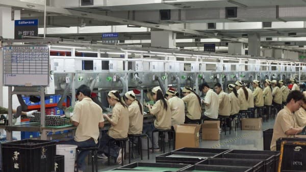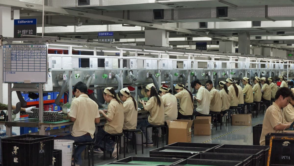 Рабочих нам все же удалось застать на производственных линиях. Фабрика Edifier достаточно большая, и пока мы посещали предыдущие цеха, обеденный перерыв у рабочих, видимо, закончился.