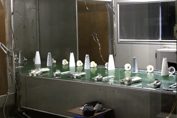 Первый цех, который мы посетили, представляет собой линию покраски различных элементов колонок. Прежде чем попасть в покрасочный цех, сотруднику необходимо пройти очистку воздухом, так называемым воздушным дождем. Во время прохода по специальному коридору со спецодежды работника фабрики сдувается пыль и мелкие частицы.