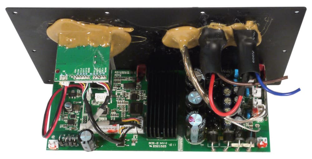 В источнике питания применен низкочастотный трансформатор на Ш-образных пластинах с двумя обмотками: 20 В 3,5 А для усилителей мощности и 12 В 0,84 А для слаботочной части. С 20-вольтовой обмотки напряжение на выпрямитель подается проводами сечением 0,52 мм² (20AWG). В фильтре выпрямителя усилителей установлены три конденсатора по 3300 мкФ. Предохранитель в первичной цепи трансформатора есть, но его замена без вскрытия корпуса не предусмотрена.