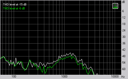 Спектрограммы гармонических искажений демонстрируют низкий уровень искажений. Во всем диапазоне уровень искажений не превышает -44 дБ, что соответствует 0,6%. Вместе с тем, на высоких и низких частотах уровень искажений ниже.