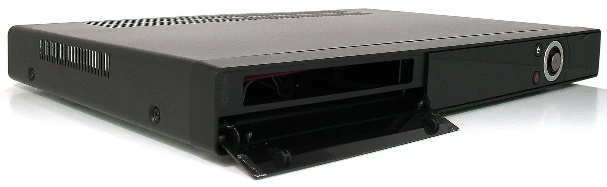 Левая часть лицевой панели рекордера выполнена также в виде откидной дверцы. Правда, она фиксируется двумя липучками, и, очевидно, задумывалась как неоткидывающаяся. И в самом деле, назначение её туманно: жёсткий диск сюда не сунешь. На самом-то деле разработчик зарезервировал этот отсек под опциональный привод Blu-ray, и при наличии прямых рук апгрейд легко произвести самому — для этого придётся демонтировать внутренний пластиковый контейнер для HDD. Правда, следует иметь в виду, что такое действие приведёт к потере гарантии на аппарат.