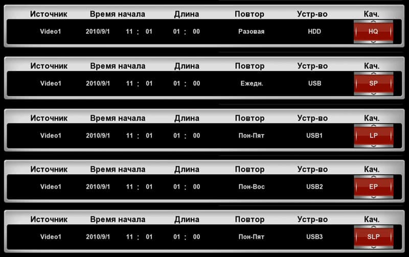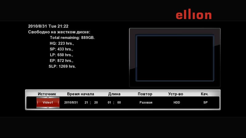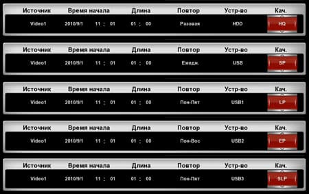 Здесь пользователь может настроить автоматическую запись в любой день недели или в одно из сочетаний дней недели; запись возможна как на встроенные HDD, так и на любое из USB-устройств. Здесь же, в планировщике, выбирается и качество записи. Это важно, поскольку разные передачи имеют разную продолжительность, а, соответственно, и политика экономии места на диске может быть разной.