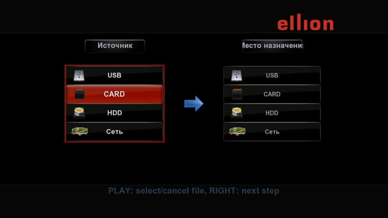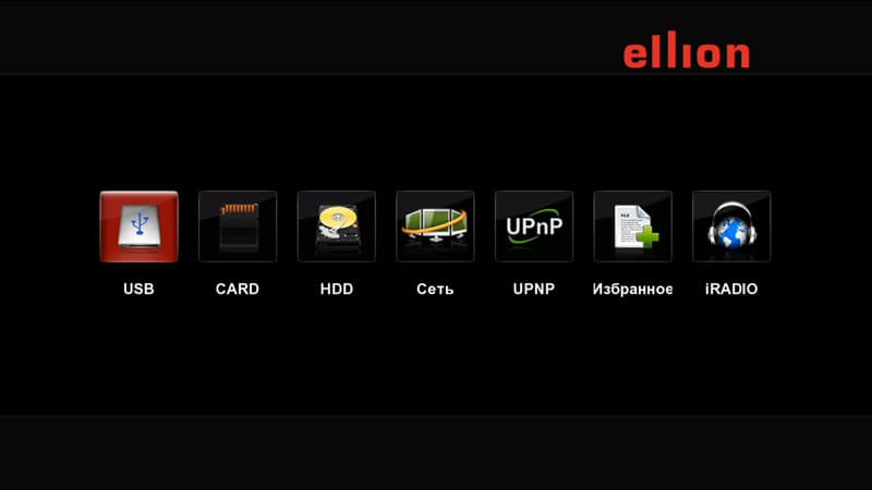 Браузер, запускаемый этой кнопкой, состоит из семи иконок: USB, CARD, HDD, Сеть, UPNP, Избранное, iRADIO.