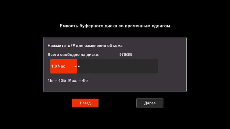 Вот теперь пора обустроить наш аппарат так, как это будет удобно владельцу. В первую очередь рекомендуется отформатировать жёсткий диск средствами плеера. Это желательно сделать для того, чтобы определить свободную область (ёмкость буферного диска), которая будет использоваться рекордером для записи в режиме временного сдвига (timeshift). При форматировании имеется возможность задать пространство, в котором поместится до четырёх часов временной timeshift-видеозаписи.