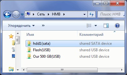 Пока не забылось, следует отметить одно редкое и полезное умение рассматриваемого рекордера: «расшаривание» внешних USB-носителей. Кому надо, тот понял, о чём идёт речь, но для менее осведомлённых пользователей всё же поясним: если к аппарату подключить флэшку либо какой-то иной USB-носитель, то в сетевом окружении ПК станет виден не только встроенный жёсткий диск рекордера, но и все подключённые к аппарату USB-устройства. На рисунке ниже — скриншот окна Проводника, в котором виден наш плеер с одним жёстким диском, а также с подключёнными к нему обычной флэшкой и ещё одним плеером, работающим в качестве внешнего жёсткого диска.
