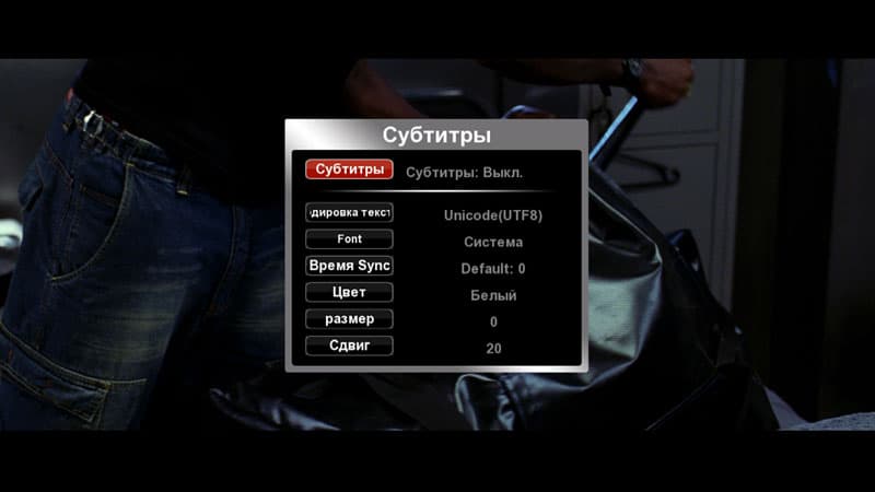 выбор аудиодорожек | выбор потока титров, цвета фона и текста, его положения |