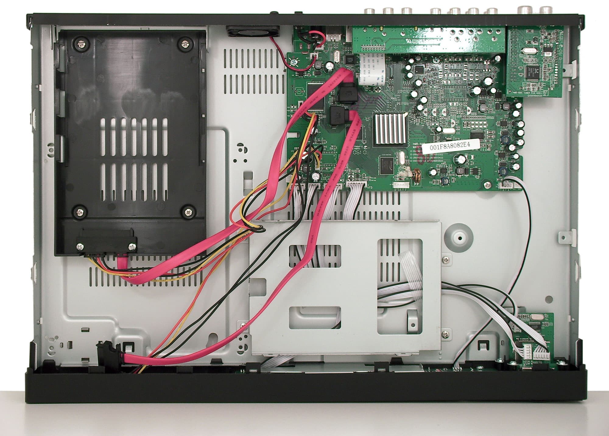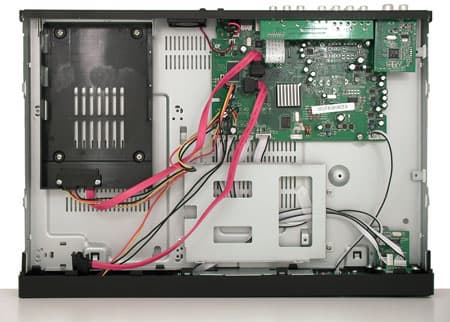 Фотография внутреннего устройства рекордера выявляет немало свободного места, это способствует качественному охлаждению электроники и — главное — жёстких дисков (один из них, как видим, монтируется внутрь аппарата только при снятой крышке). Главный чип плеера — Realtek RTD1283DD, работающий с частотой 450 МГц, прикрыт наклеенным на него радиатором и охлаждается пассивно.