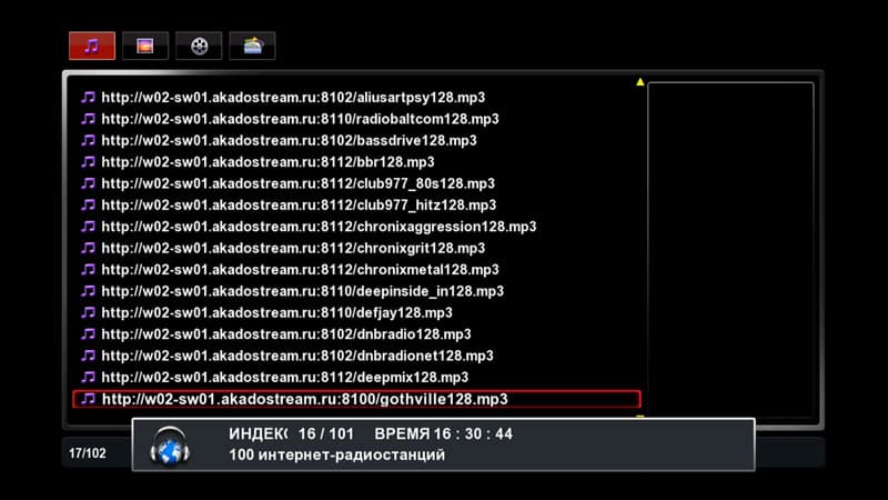 Непонятна ситуация с ресурсом iRadio. Оказалось, что рассматриваемому аппарату требуется пользовательский плейлист со списком станций, поскольку в памяти плеера готового списка не оказалось. Что-ж, загрузим на жёсткий диск плеера соответствующий плейлист, и запустим на прослушивание одну из работающих станций...