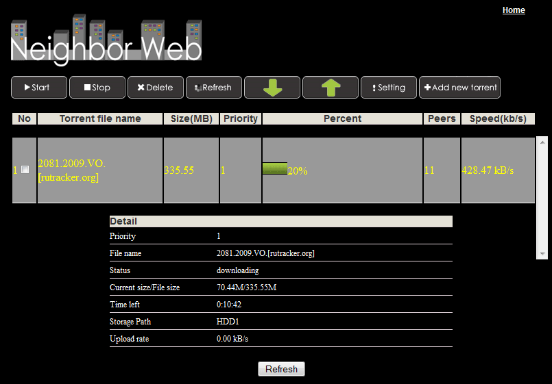 Наконец, торренты... Да, какой же домашний медиацентр нынче может обойтись без этой функции? Да к тому же аппарат, который можно оснастить жёсткими дисками общей ёмкостью до четырёх терабайт! Управление закачками здесь производится с помощью встроенного простенького сайта, который открывается, если на ПК в строке браузера вбить IP-адрес рекордера (внимание! функция BitTorrent в меню настроек аппарата должна быть включена!).