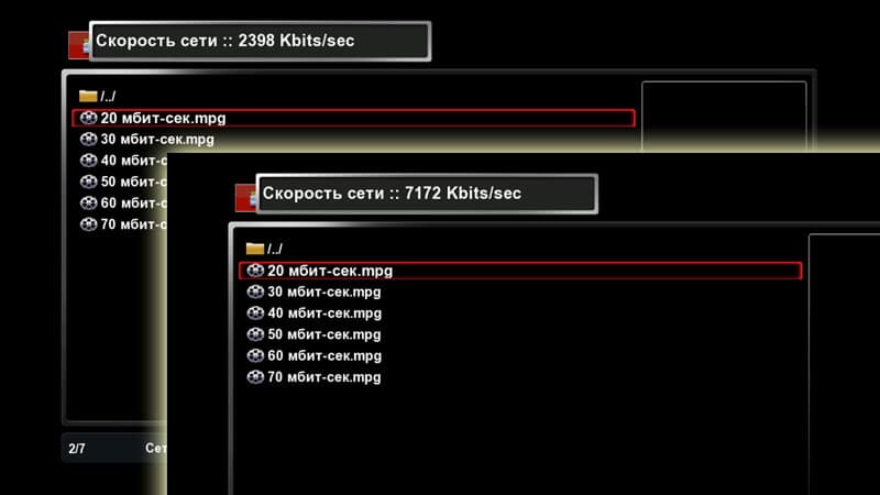 В этом ролике можно видеть, что файлы проигрываются ровно, без изъянов, но лишь до тех пор, пока очередь не доходит до 50-мегабитного видео. При воспроизведении таких файлов сразу же пропадает звук — верный признак нехватки скорости сети. Выраженные замирания (фризы) картинки появляются на 60-70 мегабитных файлах. Подобные битрейты не используются нигде, поэтому делаем вывод: скорости сети данного плеера вполне хватит для удалённого проигрывания любых существующих сегодня видеофайлов.