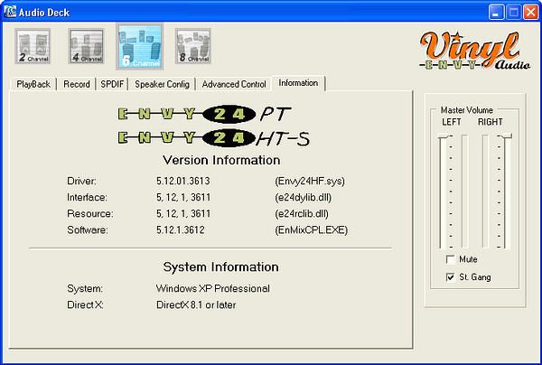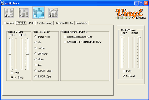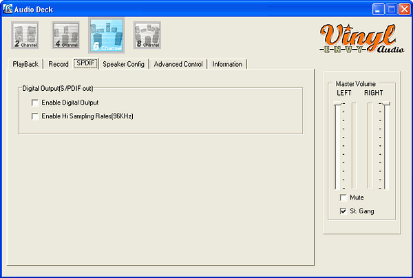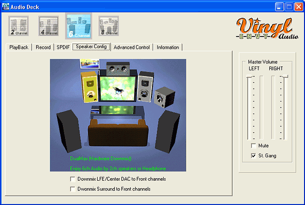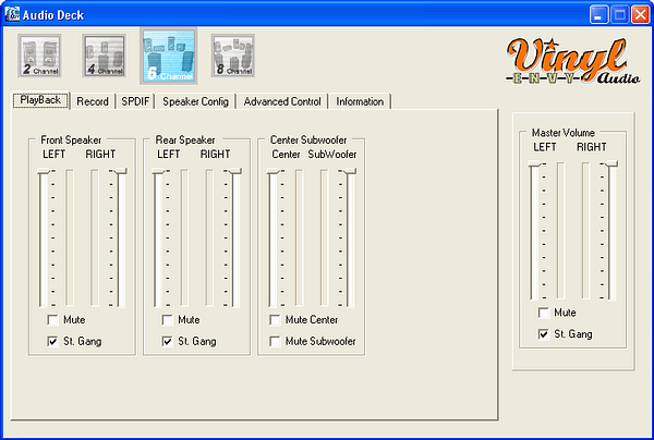 На первой вкладке PlayBack расположены регуляторы уровня сигнала всех задействованных каналов в выбранном пресете. Вообще нужно отметить, что ни на одном из регуляторов нет индикации уровня сигнала, хотя рядом с ползунками можно видеть отведенное для этого место. Возможно, у разработчиков драйверов элементарно не хватило на это времени. Что ж, будем надеятся, что эту возможность добавят в новой версии драйверов. Между тем, имеется кнопка выключения звука (Mute) и раздельная регулировка левого и правого каналов (St. Gang).