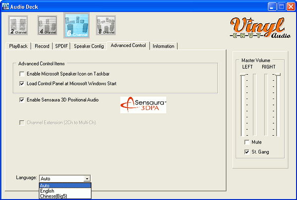 Контрольная панель управления картой выполнена весьма топорно в виде одного окна с шестью вкладками. В верхней части основного неизменяющегося окна расположены кнопки включения конфигурации сателлитов (стерео, 4 канала, 5.1 и 7.1). С правой стороны находятся регулятор уровня общей громкости.