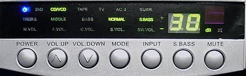 Уровень громкости здесь определяется в дБ. Самому тихому значению соответствует -79 дБ, громкому — 0 дБ. Регулировка громкости по отдельности фронта, тыла, центра и саба возможна только с пульта ДУ. Также любопытным оказалось присутствие трехполосного эквалайзера (Тreble, Middle, Bass), регулировка которого осуществляется тоже только с пульта ДУ. Кнопка S.Bass, вероятно, должна добавлять в звучание низкие частоты, но вместо этого в колонки добавляются средние и с искажениями, которые сильно ухудшают звук. Мы бы не рекомендовали пользоваться этой примочкой.