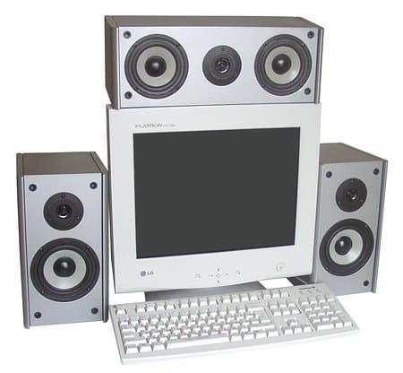 Если голые цифры вам не дают полного представления о габаритах колонок, ниже на фотографии вы можете видеть, как выглядят фронтальные и центральный спикеры рядом с 17" монитором LG Flatron.