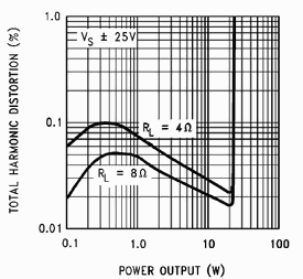 Измерив напряжение на соответствующих выводах микросхемы, мы получили значения ±18 В. Это говорит о том, что приведенный график может рассматриваться без корректировки значений по оси мощности.