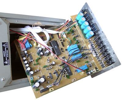 В усилительном тракте производитель использует два вида микросхем. Это пять микросхем TDA2030A от ST и две микросхемы LM1875T от National Semiconductor. Все семь микросхем промазаны термопастой и прижаты к радиатору металлической планкой (которую нам пришлось снять для демонстрации маркировки микросхем).