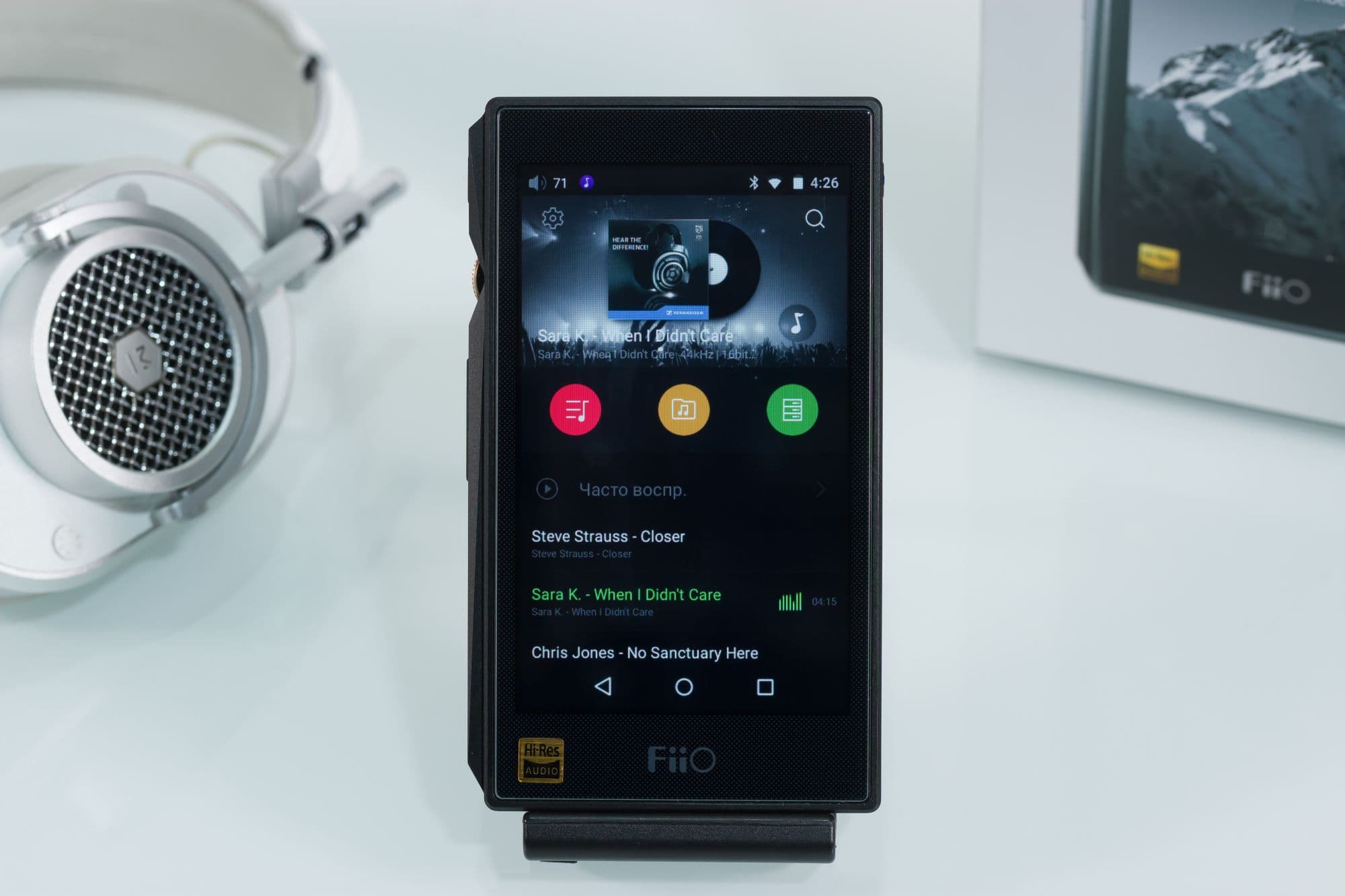 Во время оценки звучания мы активно использовали записи в формате Hi-Res, прослушивали DSD128, 24 бит 354 кГц, сравнивали с вариантом 16 бит 44 кГц, предложенным издателем записи. Разница очень небольшая, но она есть. Переключая запись с одного фрагмента на другой, можно зацепиться слухом за небольшие отличия на средних частотах. Обычный формат 16/44 чуть-чуть уступает Hi-Res в детальности и атаке. Возможно, дело в том, что запись изначально писалась в DXD, это для нее родной исходный формат. То есть качество 16 бит 44 кГц будет существенно определяться точностью конвертации, а не возможностью самого формата. Тем не менее, Hi-Res слушать очень приятно и легко. DSD звучит субъективно более шершаво и гранулированно, но эти искажения не раздражают, так как звук кажется от этого чуть-чуть подинамичнее, чем DXD. Последний, возможно, более сбалансированный и нейтральный. Выбирать между этими вариантами Hi-Res можно в зависимости от наушников — от того, более мягкий или более резкий у них звук. Native DSD имеет определенный эксплуатационный минус: в этом режиме не работает эквалайзер. То есть DXD не стоит сбрасывать со счетов, этот формат удобнее.