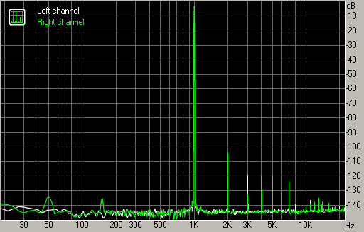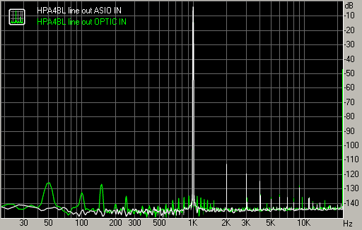 При сравнении режима приема данных по USB и по оптическому входу можно заметить, что в режиме оптики по бокам основного тона 1 кГц образуются небольшие побочные гармоники, что является наведенным джиттером. Он возникает из-за несовершенства системы ФАПЧ S/PDIF-приемников AK4118.