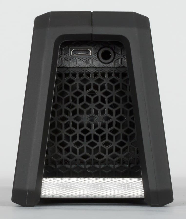 С другой стороны симметрично расположены два разъема, Micro-USB для зарядки и миниджек 3,5 мм для проводного подключения к источникам звука. А также второй широкополосный динамик.