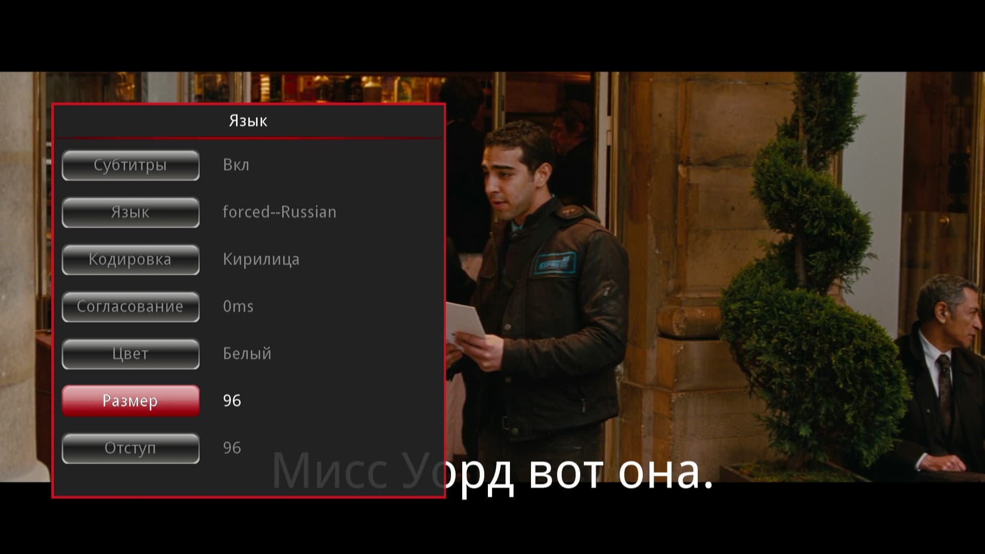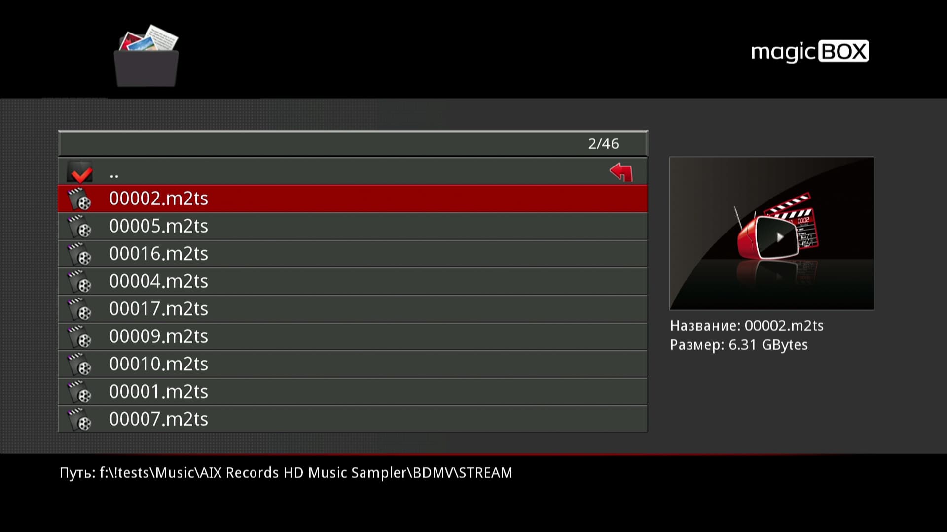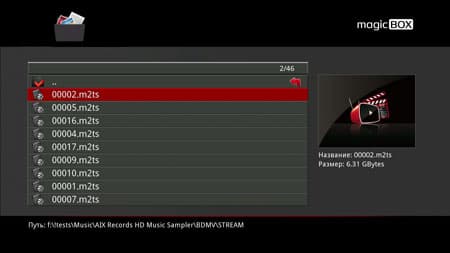 Во время просмотра видео пользователь может увеличить скорость проигрывания до 32х в обе стороны, а для быстрого и точного перехода в нужную позицию можно воспользоваться стандартной функцией GoTo. Масштабирование видео во время просмотра ограничено несколькими установками: По умолчанию, 4:3, 16:9 и Во весь экран. Выбор аудиодорожки производится соответствующей кнопкой на пульте ДУ.
