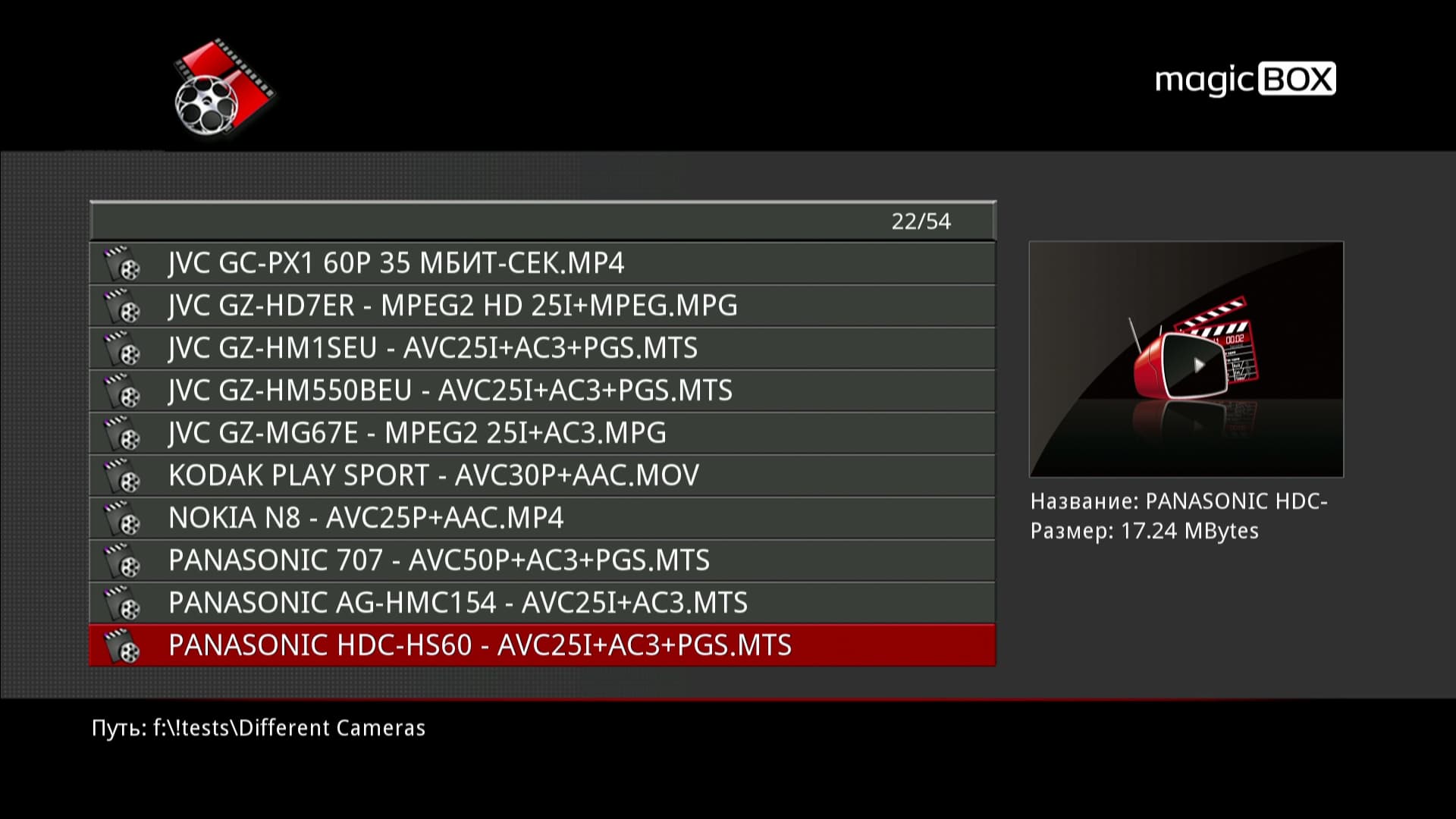 К сожалению, некоторые видеофайлы плеер воспроизводить отказался, вместо изображения — чёрный экран и отсутствие звука. Никакой зависимости или корреляции в такой избирательности найти не удалось, файлы проигрываются очень и очень избирательно. Так, плеер отказался воспроизводить видеофайл AVCHD с интерлейсной развёрткой и частотой кадров 25 в секунду и тут же преспокойно проигрывает в точности такой же, но снятый видеокамерой другой модели или производителя. То же касается и прогрессивного видео. AVCHD с частотой 50 кадров в секунду, снятый видеокамерой HDC-SD700, совершенно ровно воспроизводится плеером, и в то же время в точности такой же файл, но снятый видеокамерой HDC -SD707, ни в какую не проигрывается! Отсюда можно сделать вывод: мы наблюдаем некую недоработку прошивки. А заодно и дать совет: если вы являетесь обладателем какой-либо современной видеокамеры («древние» MPEG-и воспроизводятся плеером без проблем, тут и говорить нечего) и задумываетесь о приобретении плеера для быстрого просмотра отснятого прямо с карты памяти… Хм, в таком случае идеальным вариантом видится поход в магазин не в одиночку, а с флешкой, вынутой из видеокамеры. Только после «контрольного» просмотра можно быть уверенным, воспроизведутся ли видеофайлы с вашей камеры данным плеером.