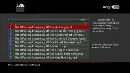 При воспроизведении аудиофайлов на экране отображается информация из MP3-тегов и текущее время проигрывания. К сожалению, плей-листы в формате CUE не поддерживаются ни для FLAC, ни для файлов APE, хотя сам звук в этих беспотерьных форматах воспроизводится, как и звук DTS в одноимённом контейнере.
