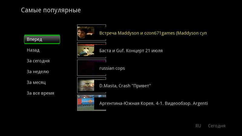 Навигация по YouTube осуществляется как по жанрам и популярности, так и с помощью текстового поиска. Автор не может гарантировать, что все до единого ролика с YouTube стопроцентно проигрываются, однако за всё время тестирования ему так и не довелось увидеть раздражающее сообщение "Формат не поддерживается".