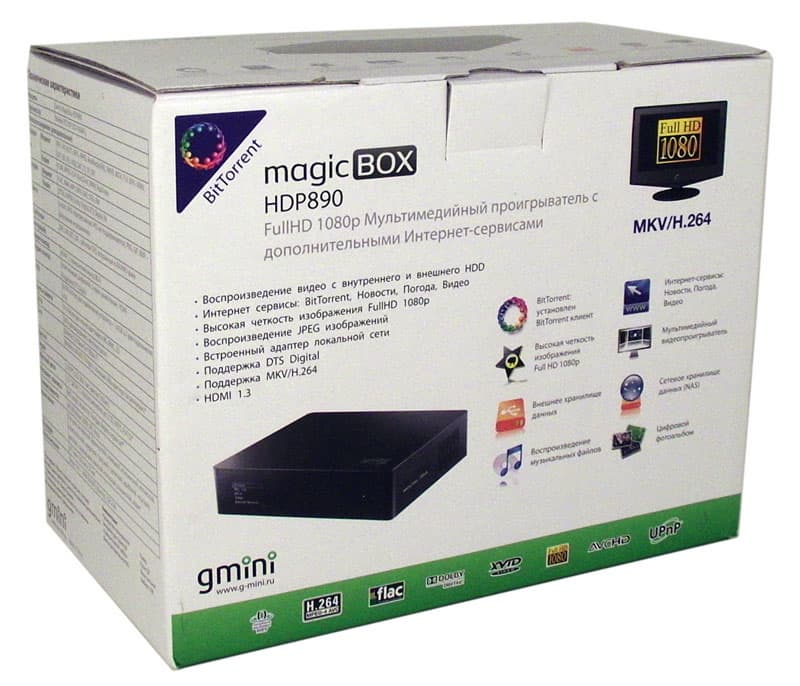 Традиционно для грамотного производителя, на коробке с товаром напечатаны все без исключения служебные сведения о находящемся внутри аппарате, от описания интерфейсов до информации о поддержке форматов видео, аудио и графики.