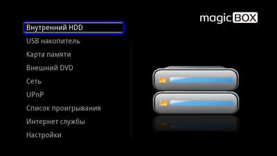 Поскольку речь зашла о меню, требуется отметить довольно грамотное и удобное его устройство. При загрузке плеера (а загружается он не дольше 10-15 секунд) активным оказывается пункт "Внутренний HDD", что подходит большинству пользователей, и с чего обычно начинается поиск медиасодержимого.