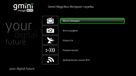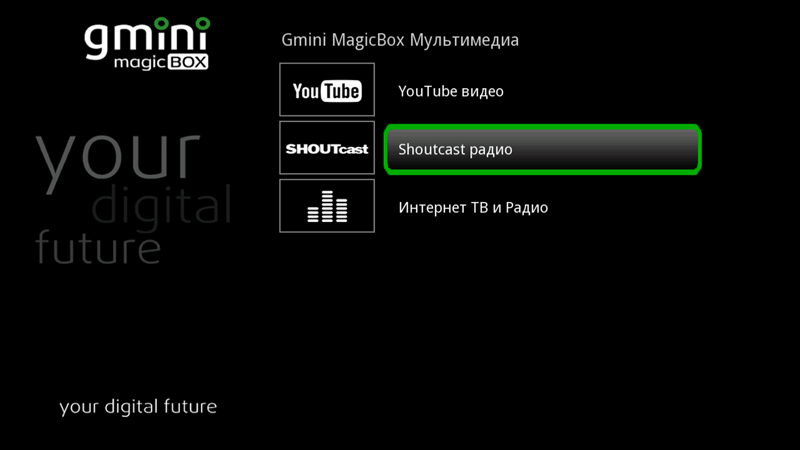 Рассмотрим их по порядку, начиная с первой: Мультимедиа. В состав этого пункта входят сервисы YouTube видео, Shoutcast радио, Интернет ТВ и Радио.