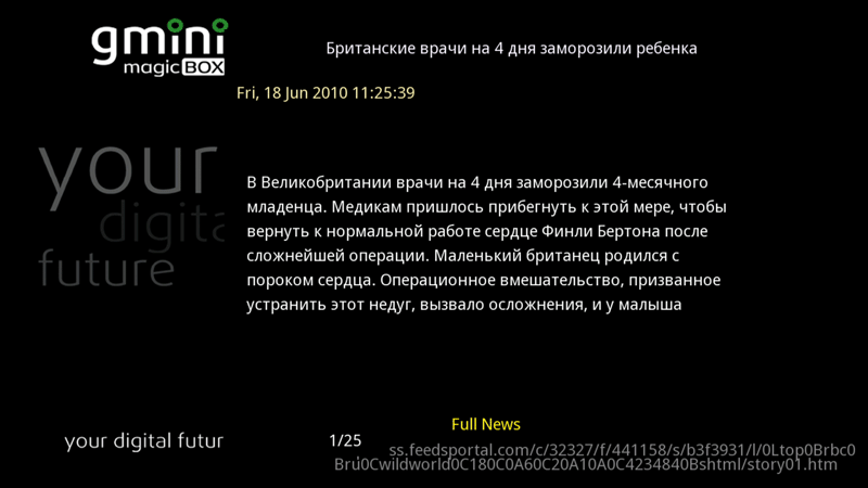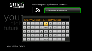 Также можно добавить и пользовательскую новостную RSS-ленту, делается это несложно, с помощью виртуальной клавиатуры. Правда, следует учитывать, что добавляемая лента должна иметь кодировку UTF-8.