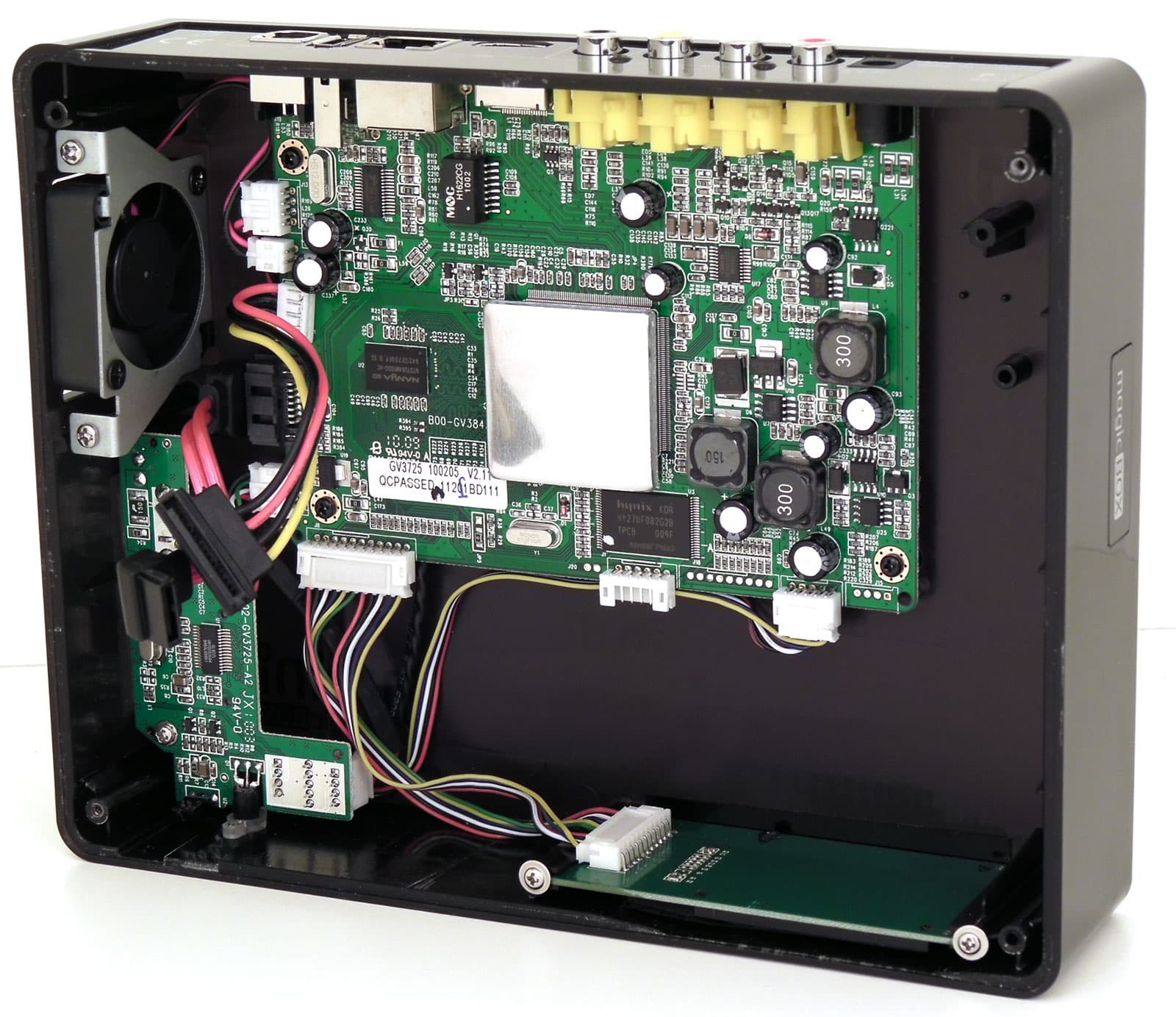 Электронная начинка, как мы видим, занимает лишь малую часть внутреннего объёма, всё остальное пространство предназначено для жёсткого диска и воздуха, охлаждающего диск и микросхему. Главным элементом печатной платы является, конечно, чип Realtek RTD1073DD 400МГц — это так называемая Система на одном кристалле (System on a Chip — SoC). Чип заклеен серебристым радиатором, помогающим рассеять излишнее тепло.