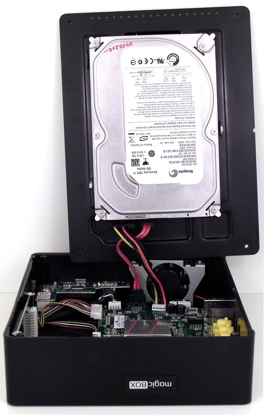 Диск монтируется непосредственно на днище плеера, привинчиваясь к специальным скобкам. После этого нижняя крышка вместе с жёстким диском крепится к корпусу четырьмя винтами, которые расположены внутри резиновых ножек. Плеер устойчив на гладких поверхностях, сдвинуть его чрезвычайно трудно.