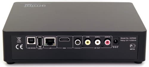 Задняя панель плеера отдана под следующие разъёмы: USB-порт для подключения плеера к ПК, второй USB-порт для подключения внешних накопителей, LAN, HDMI 1.3, цифровой коаксиальный аудиовыход, композитный аудио- видеовыход, и вход для блока питания.