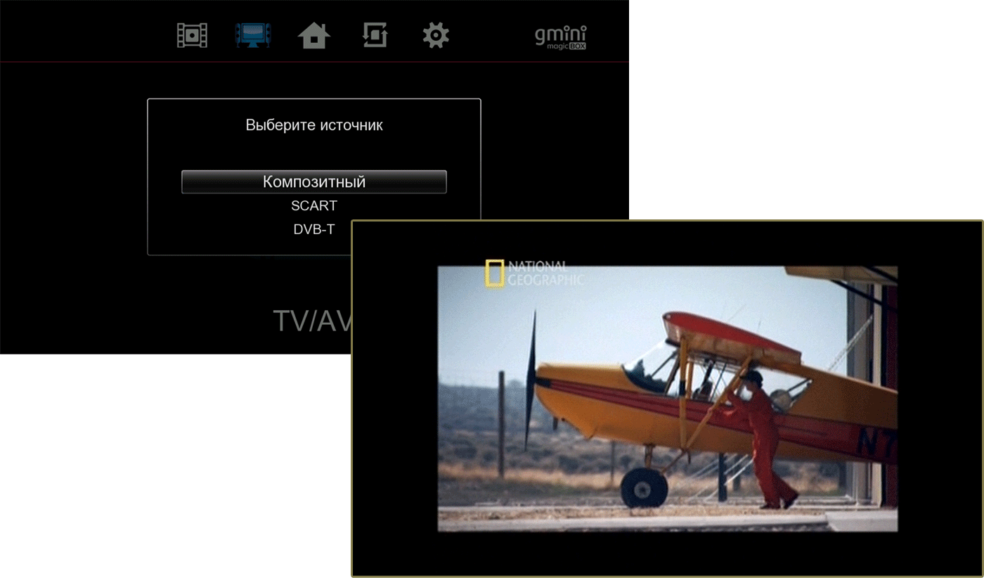 Следующий пункт — TV/AV служит для просмотра "живого" источника.
