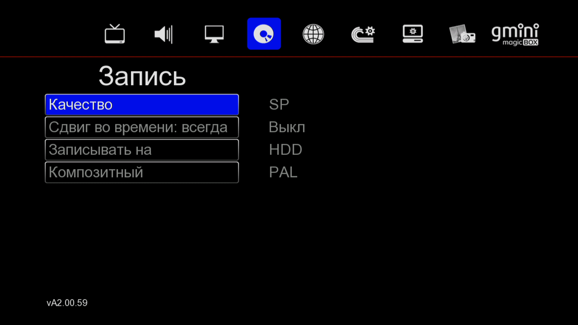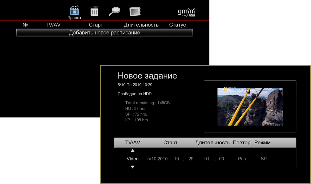 План записи | TV/AV | Просмотр | Менеджер файлов | Настройки |