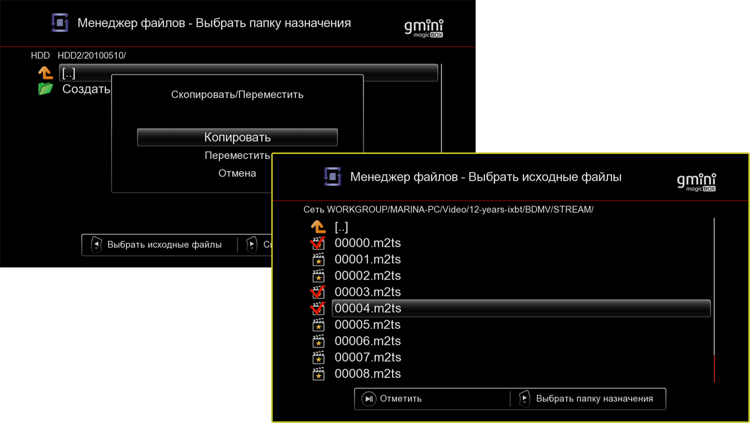 Навигация здесь осуществляется точно так же, как и в Просмотре, однако с помощью подсказок в нижней части экрана пользователь может скопировать либо переместить выбранные файлы или папки с одного ресурса на другой.