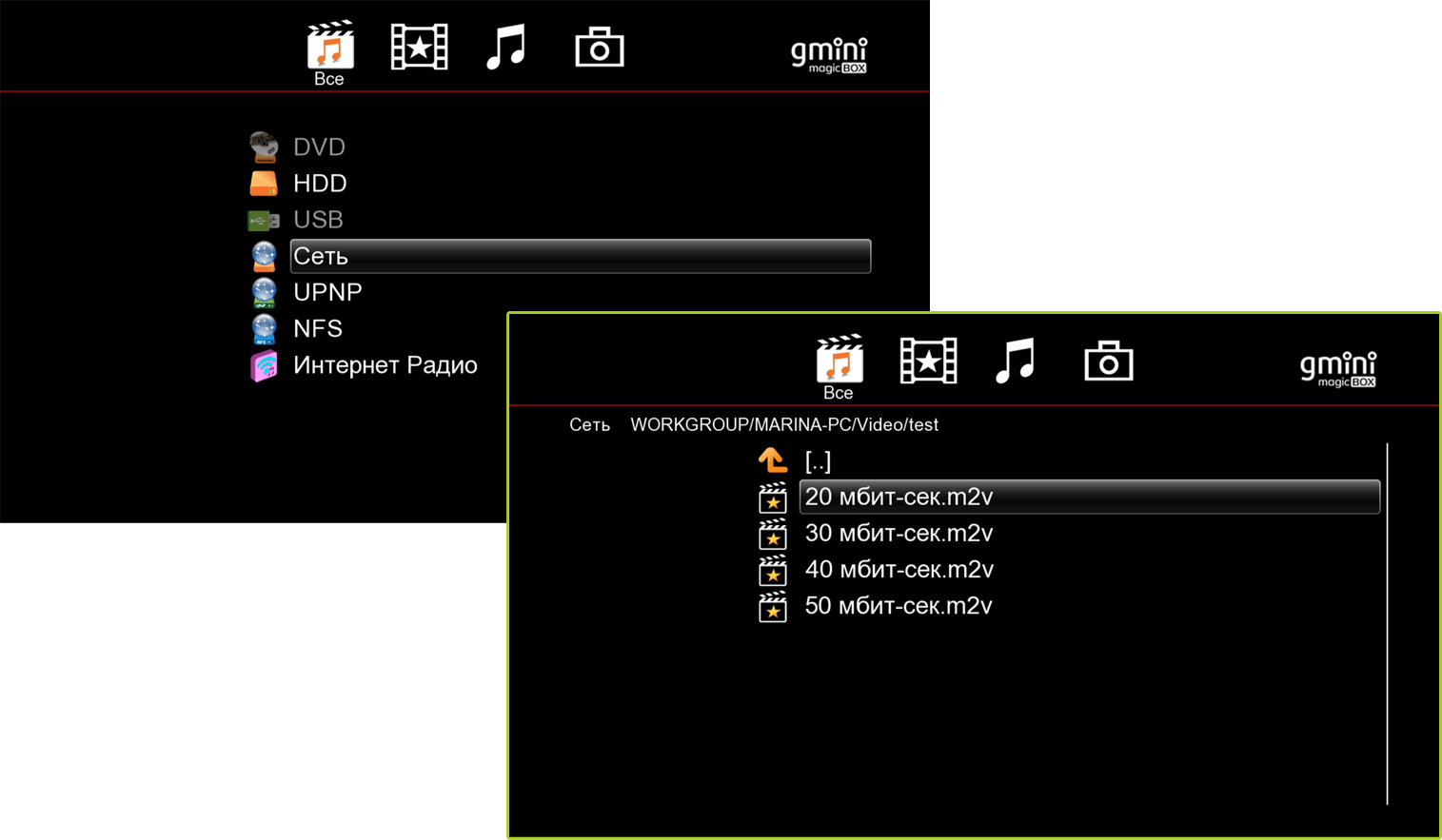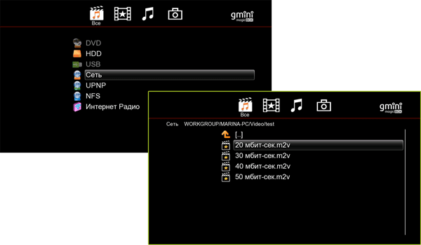 Но вот мы и подошли к обещанному тестированию скорости сети. Попробуем запустить воспроизведение видеофайлов, различающихся свом битрейтом: от 20 Мбит/сек до 70 Мбит/сек. Нам всего лишь останется смотреть, как каком из файлов споткнётся, или начнёт "заикаться" плеер. Источником видеофайлов, как видно из ролика, служит удалённый ПК, включённый в локальную сеть.