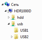 Кстати, чуть не забыли мы упомянуть и ещё одну полезную функцию: умение плеера "расшаривать" по сети подключённые к нему USB-устройства. Да, если вы подключите к аппарату флэшку или внешний жёсткий диск, то получите к нему по сети такой же доступ, как и ко внутреннему жёсткому диску (на рисунке справа можно видеть плеер и два подключённых к нему USB-накопителя).