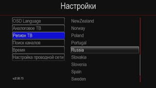 | Выбор источника сигнала аналогового телевидения: антенна или кабель. | Выбор региона аналогового телевидения |
