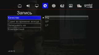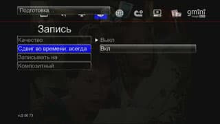 | Пользователь может выбрать одну из трёх установок качества записи. Если в рекордере установлен жёсткий диск большого объёма — можно не экономить и выбрать HQ. Так подсказывает логика. Впрочем, в нашем случае вполне можно обойтись даже самой «некачественной» установкой, LP. Почему — об этом ниже. | При активации пункта Сдвиг во времени -> Всегда -> Вкл рекордер выводит предупреждение «Подготовка» и перестаёт отвечать на запросы пользователя. В это время подготавливается файл сдвига во времени — придётся немного подождать. Через пять минут таймшифт будет готов к работе. |