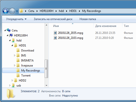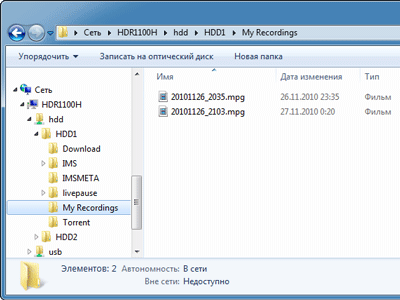 Видео, записанное рекордером, пользователь впоследствии может разыскать в папке My Recordings, которая находится на первом, «системном» разделе жёсткого диска. Имя созданного файла представляет собой дату и время записи, что кажется вполне логичным.