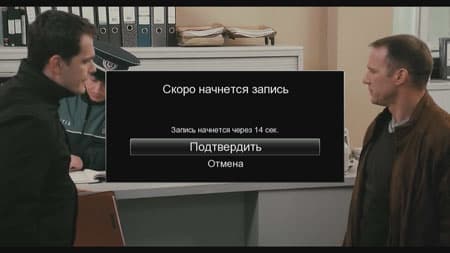 Аппарат автоматически включается за минуту до назначенного старта записи, загружается, немного выжидает, выводит на экран сообщение с двадцатисекундным таймером, после чего начинается запланированная запись. Если во время срабатывания таймера вы смотрели фильм, то это же сообщение появляется поверх видео.