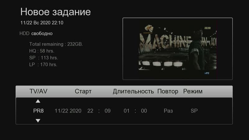 Вспомним, чем был полезен старинный видеомагнитофон? Ну конечно, возможностью вести запись в отсутствие хозяина! И в нашем аппарате такая функция, разумеется, присутствует.