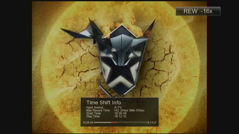 Информацию о текущей разнице между эфирным временем и временем записи можно просмотреть, нажав кнопку Info. Здесь же, на этой панели, отображаются сведения о доступном времени записи. Оно зависит от двух факторов: ёмкости жёсткого диска (раздела) и от выбранного качества записи. Также пользователь имеет возможность с помощью кнопок Rew/FF быстро переместиться в нужное время просматриваемой и записываемой передачи (например, «промотать» рекламу).