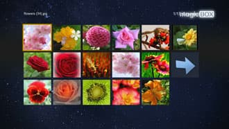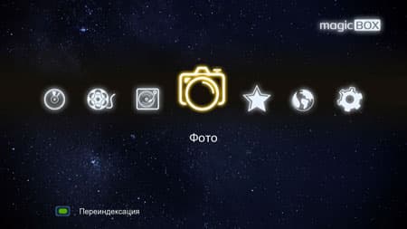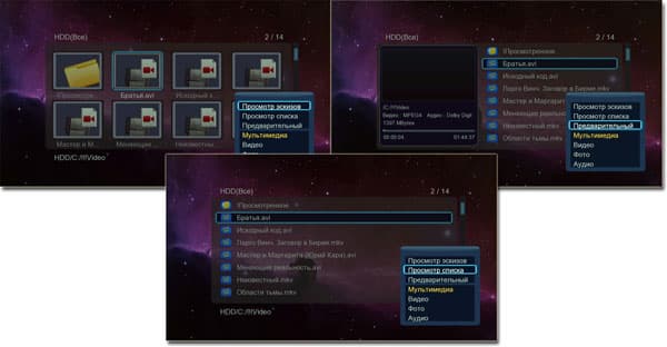 Перейдём к описанию работы плеера. Имеющаяся на пульте управления кнопка MENU выводит на экран всплывающий список команд; с их помощью можно изменить способ отображения медиаконтента или отсортировать его по категориям видео-фото-аудио.