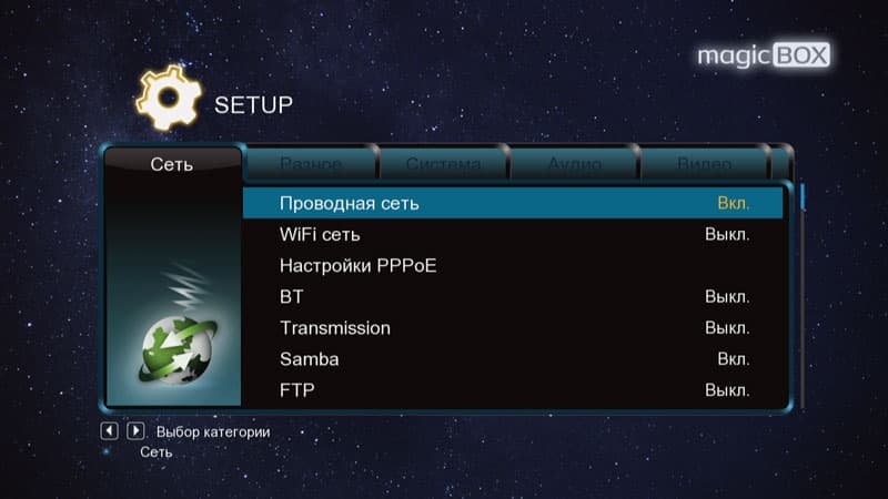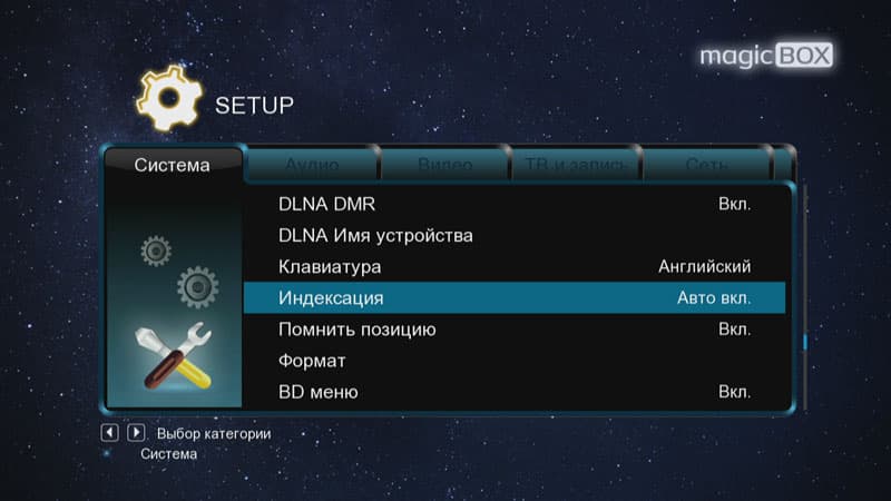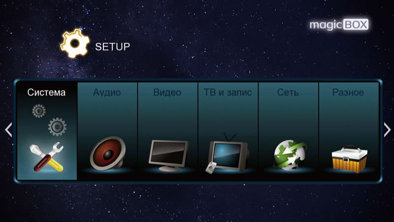 Вот к настройкам мы и перейдём — сразу увидим, на что способен этот новый плеер с новым же чипом. Имеющиеся шесть пунктов отвечают за системные и аудио/видеонастройки, параметры цифрового ТВ и его запись, сетевые настройки и прочие.