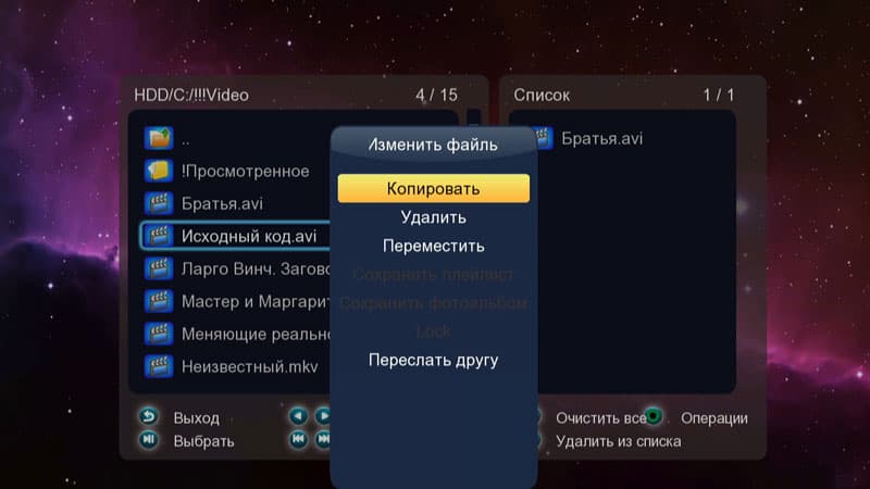 Ещё одна кнопка на ИК-пульте, называющаяся Copy, запускает встроенный в плеер файловый браузер, где пользователь может произвести такие операции, как копирование, перемещение или удаление выбранных файлов и папок с одного доступного носителя на другой, сохранение плейлиста или фотоальбома.