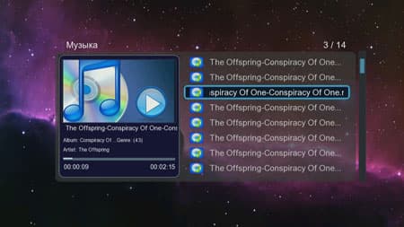 При воспроизведении музыкальных файлов на экране отсутствуют какие-либо анимированные эквалайзеры, по большей части бесполезные. Всего лишь список композиций, да и окошко прогресса.