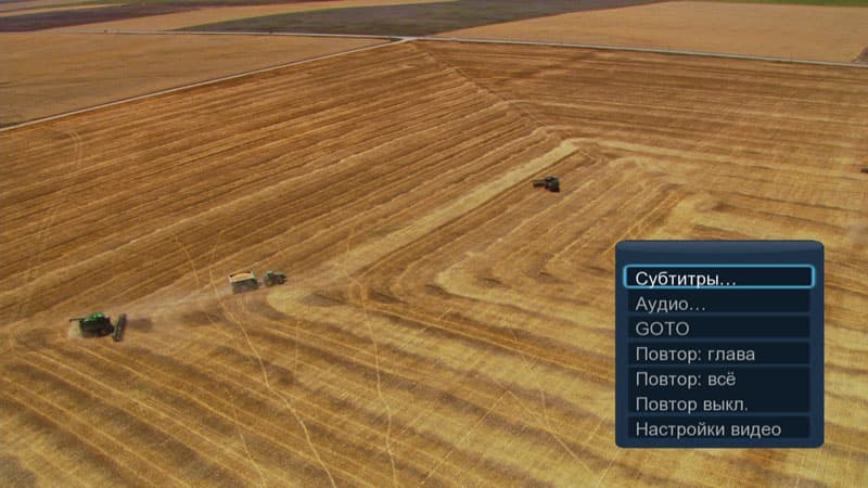 Впрочем, здесь возможен доступ ко всем этим функциям сразу: достаточно нажать во время воспроизведения кнопку Menu. Как видно из скриншота, в данном меню собраны все возможные и нужные команды: выбор субтитров, аудиодорожки, переход на нужную позицию, настройка повтора и параметры видео.